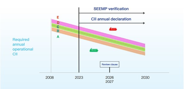 1.   CII is a part of the IMO-DCS (Data Collection System) process, that starts from 2023. After the emission data is submitted and verified, a CII rating (from A to E) will be given to the vessel based on the annual carbon intensity result.